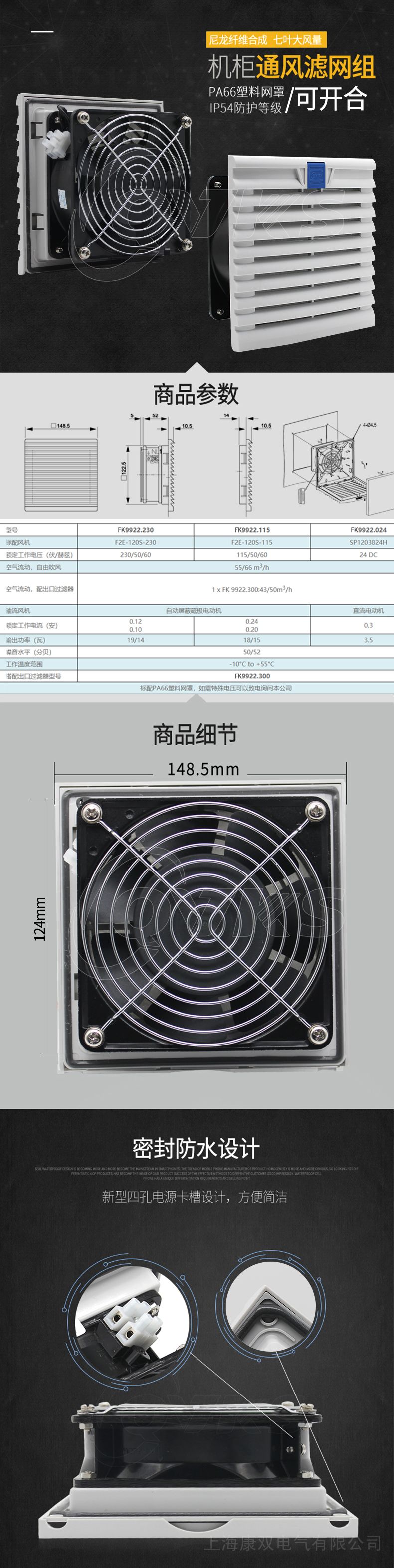 一个防喷水的罩可使防护类别达到IP54级,用也栅上的槽型握手可简易的更换过滤垫;风机及过滤器带PU发泡密封条可达到IP54防护等级风扇及过滤器